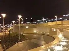 The expanded plaza adjacent to Artichoke Joe's Casino would be dedicated as Posy Park.[10] Posy Park has a water feature consisting of a fountain with cascading terraces running down from the station to street level. However, shortly after the San Bruno Grade Separation Project was completed, inspections revealed cracks in the concrete and protective coating, causing rust to the reinforcing steel rebar, and the fountain was turned off. A request for bids to rehabilitate the fountain was posted in September 2017, but no bidders materialized, and a direct solicitation resulted in an estimate of $125,000 to recoat the concrete.[16]