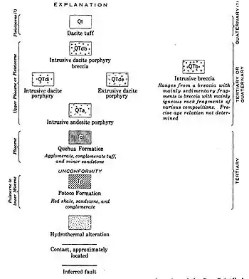 The geologic history from Tertiary and Quaternary periods includes 1) deposition and folding of the Potoco Formation, 2) erosion of this formation, 3) deposition of the Quehua Formation, 4) intrusion of the andesite porphyry stocks, 5) hydrothermal circulation altering rocks and depositing oxide-siderite-barite veins containing silver, 6) intrusion of dacite porphyry stocks, uplift of the Potoco and Quehua Formations, and deposition of dacite porphyry lava flows, 7) intrusion of breccia pipes and faulting, 8) deposition of dacite tuff, 9) hydrothermal circulation altering rocks and depositing galena, sphalerite, pyrite, native silver and barite, 10) erosion.[4]: 10