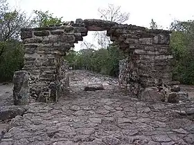 This arch is the main entrance from the north and west to San Gervasio’s District 1 Central Plaza Group. It is a simple arch about seven feet tall that straddles the main religious pathway (called a sacbe in Mayan, a word meaning "white road") running northeast from the plaza. It was reconstructed by INAH in the form of similar arches found at other sites on the east coast of Quintana Roo, such as El Cedral, located on the southern portion of Cozumel.[8]