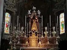In 1993, the church experienced a theft of 37 paintings. Among the sculptures are the statues of the facade of Stefano Salterio and the angels ringing on the sides of the altar major work of Elia Vincenzo Buzzi active also in the Duomo of Milan. The church is also home to the statue of the newly discovered Virgin of Giovanni Angelo Del Maino: the sculpture was part of a filing commissioned by Del Maria by Maria Maria Rusca in 1518 and later lost.