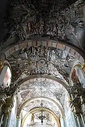 The Atotonilco sanctuary has plain high fortress-like walls.[8][5] However, the inside walls and ceilings are completely covered in murals with a large number of personages and scenes from the Bible without much overall structure in how these images were placed. This mural work was done by Miguel Antonio Martínez de Pocasangre over thirty years. The style of the painting imitates Flemish painting, which was known through Belgian prints that the Spanish brought from Europe.[5] The World Heritage Organization calls it an "exceptional example of the exchange between European and Latin American cultures" and "one of the finest examples of Baroque art and architecture in the [sic] New Spain".[6] The structure and the mural work reflect the doctrine of Saint Ignatius of Loyola,[6] and the church has been called the "Sistine Chapel of America".[9] Atotonilco has been a pilgrimage site since the colonial period.[10] The complex functions as a religious retreat for people from Mexico.[11]