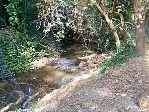 The creek runs from the southeast to the northwest, originating near Orinda and flowing into San Pablo Bay. It drains one of the largest watersheds in the East Bay, comprising some 41 square miles (110 km2).[4] The creek has 34 named tributaries.[5] The creek was dammed in 1919,[6] forming the San Pablo Reservoir. Briones Reservoir, constructed in 1964, dams the Bear Creek tributary.[5] San Pablo Reservoir essentially splits the creek in two, with about half of the creek and its related feeder creeks on either side of the artificial lake; for much of its course, it runs parallel to Wildcat Creek, which drains from Wildcat Canyon, the next valley to the west.[4][5] The East Bay Municipal Utility District (EBMUD) gets less than 10% of its water from the creek.[7]