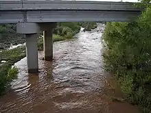 A typical river flow following the monsoon rains. This photo was taken August 16, 2005 at the Charleston Road bridge, several miles west of Tombstone, Arizona. Estimated depth at this location is 5 feet.