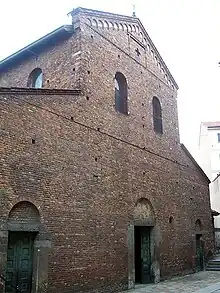 In 806 a Benedictine convent was added to the church; in the late years of the same century and in the early tenth century the deteriorating church was rebuilt, but with similar appearance. The octagonal baptistery on the exterior, on the left, was built by architect Paolo Mezzanotte in year 1932, and includes a column-shaped font called Pietra santa (the Saint Stone) coming from the ancient church of S. Nazaro in Pietra Santa, which was demolished in year 1889 during the construction of the new Via Dante.[1] The convent was suppressed in 1520 and in 1598 the church was restored and turned into a parish.