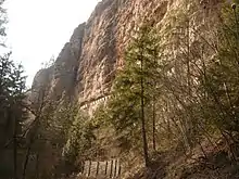 The sanctuary is accessible by car via Sanzeno, or on foot along the sentiero delle forre di San Romedio, an arduous route along a former aqueduct constructed in the mid-19th century for irrigation, recently converted into a very steep footpath over the sheer ravine wall.[5]