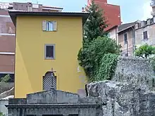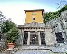 When the veneration of the image first began, it must have been located in an open-air roadside aedicula along the then public road leading to Castel Gandolfo and Albano Laziale, corresponding to today's Via Antonio Fratti.[9] The image was connected to the built-up area by a staircase of thirty-four steps carved into the peperino stone, which allowed the visitor to avoid the steep bend in the road and which is still visible today at the back of the sanctuary.[9] The veneration of the image is also linked to a miraculous event reported by popular tradition: it is said that a man, while riding his horse on the Via Maremmana Inferiore in the direction of Castel Gandolfo and Albano Laziale, lost control of the animal in the hairpin bends of the road and was in danger of falling into the precipice had not Our Lady intervened to save him.[10] In the following centuries, other miracles were attributed to the Virgin of Acquasanta: in August 1883, the high prelate Pietro Rota,[11] archbishop of Carthage and canon regular of the St. Peter's Basilica in Rome, made an ex voto to Mary to thank her for saving him from a ruinous fall from a horse in the precipitous paths on Lake Albano;[12] and so many other episodes,[12] even quite serious ones.