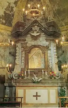 The high altar, carved from a large block of isolated peperino stone probably in the eighteenth century,[16][24] houses the Marian image framed by festoons and stucco volutes,[16] and surmounted by two broken tympanums in the center of which reads the inscription in Latin: "apud Te est fons vitae - Psal XXXV" ("at you is the source of life," "Psalm 35").[16] On the two tympanums, two small statues depicting curly-haired children are placed:[24] in the center, a small roundel depicting God and the Holy Spirit stands to represent, in connection with the Child Jesus below, the Trinity.[16]