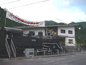 Sandankyō Station and preserved C11 steam locomotive in 2003