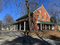 The Quakers built their current brick meeting house in 1817, replacing a 1770 frame meeting house. Quakers first began worshiping in the area circa 1753.[1][5][6] The site is near a fresh-water spring that gave its name to the community.[3] The location of this meeting house in the village of Sandy Spring helped to define the geographic extent of the greater Sandy Spring neighborhood of the time, comprising those areas from which members of the Meeting could travel to and from the meeting house by horse or carriage in one day, arriving home before sunset. The greater Sandy Spring neighborhood thus includes the current communities of Brookeville, Olney, Norbeck, Ednor, Brighton, and other communities within a six-mile radius of the meeting house.[7]
