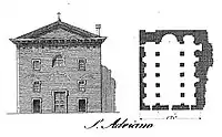 Its name refers to the martyr Adrian of Nicomedia. Paintings are still visible in a side chapel which depict scenes from the life of St. Adrian; there are also some Byzantine paintings.[2] It was designated by Pope Sergius I (687-701) as the starting point for the litanies during certain the procession liturgical feasts of the Virgin Mary, Presentation in the Temple, Annunciation, Assumption and Nativity.[3] Pope Gregory IX made substantial changes to the building in 1228. In the 17th century its large bronze doors were moved by order of Pope Alexander VII to adorn the main portal of the Basilica of St. John Lateran.[2]
