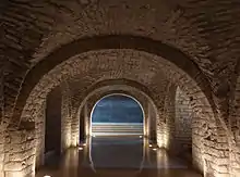 The first church was rectangular in shape with three naves separated by columns, a main door on the east side facade, and other building which connected with the monastery. During the 11th century, two semicircular apses were added, the remains of which were found in the excavations of the 1980s. The most important addition occurred in the 12th century which included a platform built in the middle of the nave and beneath it was a crypt adjoining other section various stairwells. Following further reforms in the 18th and 19th centuries, the building was preserved, though half the size of the original. The upper floor is used for worship and the nave has a barrel vault with various windows arches. Only the walls remain of the cloister and monastic rooms.