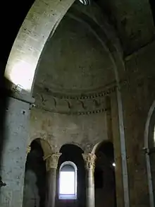 The ambulatory consists of eight columns in pairs with carved capitals holding five arches on which the apse vault is located. The theme of the capitals is varied from acanthus leaves to human figures, with one of them representing Herod the Great being advised by the devil and the Massacre of the Innocents.