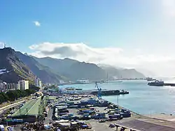 Santa Cruz is located in the northeast quadrant of Tenerife, 210 kilometres (130 mi) off the north-western coast of Africa within the Atlantic Ocean. The distance to the nearest point of mainland Spain is 1,300 kilometres (810 mi). Between the 1833 territorial division of Spain and 1927, Santa Cruz de Tenerife was the sole capital of the Canary Islands, until 1927 when a decree ordered that the capital of the Canary Islands be shared, as it remains at present.[8][9] The port is of great importance and is the communications hub between Europe, Africa and Americas, with cruise ships arriving from many nations. The city is the focus for domestic and inter-island communications in the Canary Islands.[10]