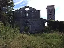 Construction here putatively started in the 9th-century, linked to a victory by the army of Charlemagne against a marauding Saracen army in the plain nearby.[1] The first documentation of the monastery is found in documents from the Abbey of Farfa, and controlled much of the surrounding territory. The Abbey is also mentioned in documents by popes Leo X and Innocent X.[2] An inscription on the façade states that presbyter Bartholomew restored the church in 1219. By the early 1500s, the monastery fell in to rapid decline. Replaced by Franciscans in 1582, the Benedictines were reintroduced in 1683. But ultimately the monastery was abandoned after the Napoleonic invasion. The land was used as a cemetery in the 19th-century but the structures continued to be looted for stone.[3] An earthquake in the 19th-century caused near collapse. The present ruins were reconstructed in the 1950s.
