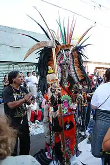 After the Spanish conquest of the Aztec Empire, the worship of death diminished but was never eradicated.[21] Judith Katia Perdigón Castañeda has found references dating to 18th-century Mexico. According to one account, recorded in the annals of the Spanish Inquisition, Chichimecs in central Mexico tied up a skeletal figure, whom they addressed as "Santa Muerte," and threatened it with lashings if it did not perform miracles or grant their wishes.[22] Another syncretism between pre-Columbian and Christian beliefs involving death can be seen in Day of the Dead commemorations. During these commemorations, many Mexicans flock to cemeteries to sing and pray for friends and family members who have died. Children partake in the festivities by eating chocolate or candy in the shape of skulls.[23] Perdigón Castañeda, Thompson, Kingsbury,[24] and Chesnut have countered the argument that Santa Muerte's origins are not Indigenous proposed by Malvido, Lomnitz, and Kristensen; stating that Santa Muerte's origins derive from authentic Indigenous beliefs. For Malvido this stems from Indigenist discourse originating in the 1930s. Nevertheless, through ethnoarchaeological researches by Kingsbury and Chesnut as well as archival work by Perdigón Castañeda, proof has been established that there are clear links between pre-Columbian death deity worship and Santa Muerte supplication. As Kingsbury has pointed out, to deny the Indigenous roots of Santa Muerte is to promote neo-colonialism and the denial of Indigenous influences and cultures as important still in the current context.