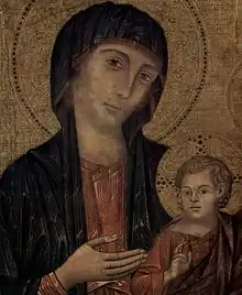 The Santa Trinita Maestà (Italian: Maestà di Santa Trinita) is a panel painting by the Italian medieval artist Cimabue, dating to c. 1288-1292. Originally painted for the church of Santa Trinita, Florence, where it remained until 1471, it is now housed in the Uffizi Gallery of Florence, Italy. It represents the Madonna enthroned with the Baby Jesus and surrounded by eight angels and, below, four half portraits of prophets.