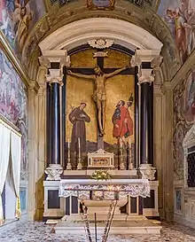 In 1622 the rib vaults of the aisles were put in place, and as soon as they were finished, the great vault of the nave was built.[45] Everything seems to be finished in early 1623.[46] In the same year the new sepulchral ark sculpted by Giovanni Antonio Carra was also installed, finding its place in the center of the chancel.[47] A few months later, the bodies of the two saints were finally moved there during a solemn ceremony.[48] Decorations then began to be discussed: on September 5, 1625[49] a contract was signed with the painters Antonio Gandino and his son Bernardino, who two months later began the drafting of the work in the large panel in the nave.[46] Similarly, in 1626 the painter Tommaso Sandrino began frescoing the rest of the covers starting with the last vault of the right aisle: all work was finished by 1629.[46] In 1630 the tragic "Manzonian plague" occurred, which considerably slowed down the works for at least a decade.[46] Documents mention building works inside the church again only in 1639, when the new ornamentation for the altar of the Blessed Sacrament was commissioned, designed by Agostino Avanzo and made by Giovanni Antonio Carra's sons: Giovanni and Carlo. The affair dragged on quite a bit and the altar could only be finished at the end of the century.[46] In 1643, work began on the rebuilding of the chapel of St. Honorius, at the head of the right aisle, supported financially by the powerful Calini family, which had acquired the sepulchral area in front of it with the commitment to renovate the chapel's furnishings and architecture.[50] Antonio Comino again took care of the matter, but it was to be his last work: the architect died the following year.[51] On the other hand, the construction of the altar of St. Benedict, the third on the left, by Giovanni Carra[46] began in 1649. At the end of the century, the altar of the Nativity was also put in place at the hands of Santo Calegari the Elder: when the work was completed, the canvas by Lattanzio Gambara, made almost a century and a half earlier, was mounted inside it.[52]