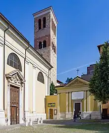 By mid-century, however, the physical condition of the church seemed to be verging on the worst: the place was no longer diligently officiated at and the worship of the remains of the two martyrs neglected.[3] Ramperto, elected bishop in 815 and a great promoter of the cult of the patron saints, underwrote donations in 841 in favor of an establishing "cenobium monachorum"[4] near the little church, probably boosting an already existing religious community.[3] Most likely, Ramperto did not limit himself only to this, but planned a real operational program: to enforce and better administer the bequests of the faithful, to lead to better preservation of relics, and to have from the exemplary behavior, which would be imposed on the newly established monastery, stimulus for the population to do good.[3] Consequently, it is also likely that Ramperto provided for an initial reconstruction of the church and bell tower.[3][5] In 843 it was again Ramperto who intervened in the church, where he replaced the sepulchral ark of the saints with a marble one, within which a lead tablet bearing the dedicatory inscription was left. Ramperto's work, in essence, proved essential: by founding a monastery hinged around the cult of the relics of the two martyrs, he laid a solid foundation for the subsequent growth of the monastic community.[6]