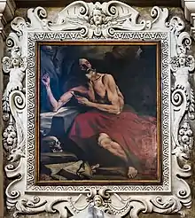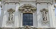 The four lesenes are not equidistant, but the central intercolumn is wider to accommodate the entrance portal to the church. Two free-standing Tuscan columns, resting on a high pedestal, frame the opening, while the upper entablature is covered with a rich decoration of plant motifs. This is followed by a low arched pediment immediately broken to allow the elevation of a rich crest, decorated with putti, volutes and floral motifs. In the central panel is the Martyrdom of Saints Faustino and Giovita by Santo Calegari the Elder, a marble high relief with iron inserts, usually remembered as one of the great masterpieces of Brescian Baroque sculpture.[56] Of great effect within the scene is the figure of the executioner completely in relief, whose drawn sword, made of iron, even protrudes outside the frame. In the space between the two lesenes on the side of the portal, on the other hand, statues of the two titular saints, again the work of Santo Calegari,[56] are placed within niches. Inside the upper pediment, on the other hand, is placed a rich Baroque cartouche, one among the pieces made personally by Giuseppe Cantone.[57]