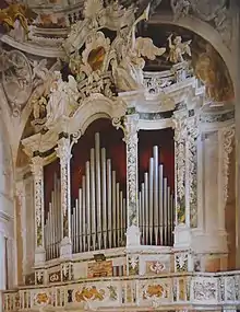 However, the grand project almost immediately suffered a major setback, caused by the tragic events of the reconquest of Brescia by Milan at the hands of the French, which would end with the bloody sacking of 1512.[26] The building revival of the monastery, most likely, was not to take place in the years immediately following, as Venice regained possession of the city once again: from 1520 onward, however, the works experienced intense activity.[27] In 1532 the organ by Gian Giacomo Antegnati was installed, while the structures of the monastery, especially the cloisters and the new dormitory, were substantially completed.[27] However, in the second half of the century, Lattanzio Gambara frescoed the entire presbytery area: his work would be admired a few years later, in 1566, by Giorgio Vasari, who was visiting Brescia.[28][29] Meanwhile, master builder Geronimo Tobanello, who was already working in other areas of the monastery, took care of the first adaptations of Renaissance architecture inside the church, affixing on the walls of the aisles, around the chapels, a rhythmic succession of marble lesenes, all designed by Giovanni Maria Piantavigna.[28] The first chapel on the right was also renovated, building a new altar reusing parts of the old one and dedicating it to St. Michael the Archangel.[28] The work was taken over during the visit of St. Charles Borromeo in October 1580,[30] who took note of both the embellishment lesenes and the new chapel and ordered that the north wall of the church, which had remained intact up to that time, be broken through to create three new mirrored chapels.[31]