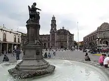 To the south of the church is Plaza San Domingo. It is flanked to the west by the Portal de Evangelistas,[1] which is a Tuscan colonnade with round arches.[2] Scribes with typewriters and antique printing machines work in this Portal.[1] Scribes offer their services to illiterate clients, often offering services similar to that of lawyers, counselors, and financial consultants. A statue of Josefa Ortiz de Dominguez, a heroine of the Mexican War of Independence stands in a fountain in the middle of the plaza. It was sculpted by Enrique Alcati.[2]