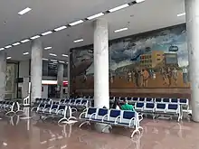 It was also in 1936 that the construction of a new passenger terminal began. It was a project led by the architects MMM Roberto (Marcelo, Milton and Mauricio Roberto Doria-Baptista) inspired in the Paris–Le Bourget Airport terminal. Its pioneering, modernist, architectural features created a Brazilian national landmark. It was only in 1947 that its construction was completed. This building continues to be used to the present day. In the lobby of this terminal, (now the arrivals terminal) two monumental paintings by Cadmo Fausto de Sousa can be seen. Named "Old Aviation" and "Modern Aviation", they feature many old and new means of flying. Both were unveiled in 1951.[7]