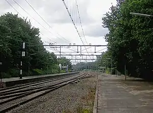 Santpoort Noord railway station is located in Santpoort-Noord, the Netherlands. The station opened 27 September 1957 on the Haarlem–Uitgeest railway. The station has 2 platforms. The station was situated at the junction with the railway to IJmuiden, which closed on 25 September 1983. That line re-opened between 1996 and 1999, when Lovers Rail operated a service between Amsterdam and IJmuiden.