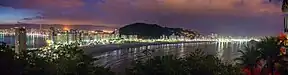São Vicente is located on the western half of coastal São Vicente Island, being mostly a bedroom community for the larger and wealthier neighbouring port and commercial city of Santos on the island's eastern half.[6] A small north–south hill range separates for the most part the two cities' urban areas, but they are contiguous in the north and on a narrow beach strip in the south. A narrow strip of land of the basin of the small Cubatão River extends west out of the central area of São Vicente, north and parallel to the municipality of Praia Grande.