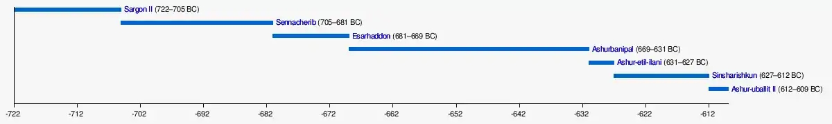 The Sargonid dynasty was the final ruling dynasty of Assyria, ruling as kings of Assyria during the Neo-Assyrian Empire for just over a century from the ascent of Sargon II in 722 BC to the fall of Assyria in 609 BC. Although Assyria would ultimately fall during their rule, the Sargonid dynasty ruled the country during the apex of its power and Sargon II's three immediate successors Sennacherib (r. 705–681 BC), Esarhaddon (r. 681–669 BC) and Ashurbanipal (r. 669–631 BC) are generally regarded as three of the greatest Assyrian monarchs. Though the dynasty encompasses seven Assyrian kings, two vassal kings in Babylonia and numerous princes and princesses, the term Sargonids is sometimes used solely for Sennacherib, Esarhaddon and Ashurbanipal.