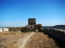 The village of Enisala (Turkish: Yeni Sala, Bulgarian: Ново село, "New Village") is the site of a fortress dominating nearby lakes (previously gulfs) of Razelm and Babadag. Dated to the late 13th or the beginning of the 14th century, it was built to control the travel routes that passed through the region. The fortress' three hexagonal towers are the only ones of this type found in the whole region of Dobruja. There are several competing theories regarding its builders. On the one hand, some historians consider that its architecture is reminiscent of the Western manner of planning, and attribute it either to the Genoese, who held several trading posts in the area, or to the Byzantines, who intermittently controlled the region. On the other hand, other historians consider the towers very similar to ones found in Tsepina, Shumen, Perperikon, Vidin, consequently attributing it to Bulgarians, who are also known to have controlled the region at certain times during the probable period of construction. All written mentions of the fortress postdate its abandonment, making a definite attribution improbable. The castle was first conquered by the Ottomans in 1388/1389, and retaken in 1416/1417 after a brief Wallachian rule. Due to the new political situation and the development of sand spits that hampered trade, the fortress gradually decayed, and was finally abandoned around the end of the 15th century.