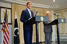 John Kerry and Aziz address reporters during a news conference in Islamabad.