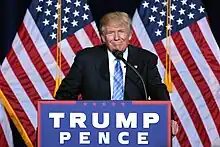 Republican candidate Donald Trump — who hosted SNL the previous season and eventually secured the presidency in November — was unhappy with his portrayal on the show by recurring guest Alec Baldwin. On multiple occasions, both before and after winning the election, Trump used Twitter to publicize his thoughts on the impersonation, as well as the show: "Watched Saturday Night Live hit job on me. Time to retire the boring and unfunny show. Alec Baldwin portrayal stinks," he tweeted the morning after the Emily Blunt/Bruno Mars episode on October 16, 2016.[54] "It is a totally one-sided, biased show —nothing funny at all. Equal time for us?", he posted on November 20 after the Kristen Wiig/The xx episode, suggesting the show follow the equal-time rule, despite the presidential race being over.[55] His criticism continued preceding his inauguration: he dubbed it "unwatchable" on December 4,[56] and tweeted "Saturday Night Live is the worst of NBC. Not funny, cast is terrible, always a complete hit job. Really bad television!" after the Felicity Jones/Sturgill Simpson episode on January 15, 2017.[57]