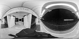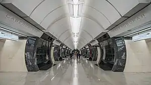 Construction on the station began in 2012.[6] At first, the city intended to use typical underground tunneling methods for the station, which is 65 meters (213 feet) underground. Project engineers suggested a new technology that would involve a single-vaulted design that is more commonly used for shallow stations constructed using cut-and-cover methods. This could reduce the construction time from 36 to 24 months.[7] The city originally expected the station to be ready by 2016.[8] This later was pushed to 2017 and, eventually, the beginning of 2019.[9][10] Because of the time and difficulty of building such deep stations, the Head of Construction for Moscow Marat Khusnullin said that this would be the last deep station built in Moscow.[11]
