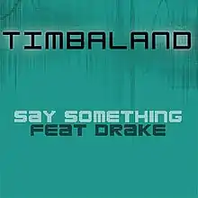 "Say Something" is a song recorded by American producer, songwriter and rapper Timbaland, for his third studio album Shock Value II (2009). The song features vocals from Canadian rapper Drake. It was written by Mosley, Jerome Harmon, Graham, Timothy Clayton and John Maultsby. The production was helmed by Mosley under his stage-name Timbaland while Harmon served as the assistant producer, under the stage-name Jroc. The song was tailored to Drake's sound and when the rapper wrote to it, he contacted the producer about the lyrics. Despite the verses feeling more like Graham's record, Mosley gave his blessing and went the product. The song was solicited to digital retailers on November 3, 2009 in the United States as the album's second single.