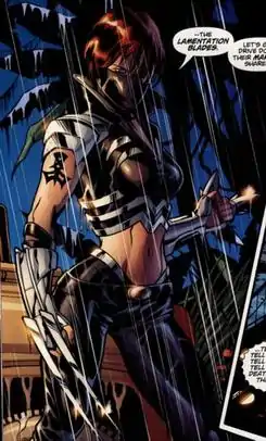 In combat, she often employs a set of retractable, wrist-mounted blades - the Laminas Pesar or "Lamentation Blades", which Scandal claims have been in the family for a long time. The blades have two settings. One is a pair of long, awl-like blades designed for stabbing. The other is three knife-like blades designed for slashing. She was also seen riding a motorcycle and seemed to be capable of combat while still riding this (though this was never seen).