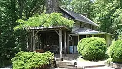 The farm's main structure is the Scanlon Log House, a two-story log structure built around 1840 by the Larimore family and acquired by the Scanlon family in the 1860s.[2] It is a folk house of the Midland tradition, in the early German settlement era pattern.[2] The house is one room deep and linear in design with external chimneys on both gable ends of the house. The logs in its construction are squared, hand-hewn, and laid horizontally, notched on the ends, and with narrow chinking.[2] (Chinking refers to the mortar between the logs). There are vertical end logs that serve to anchor the structure's four corners. The two massive stone chimneys are original to the house, although the east side has been partially rebuilt.[2] The side-gable roof is moderately pitched and is composed of slate. The Scanlon Log House was constructed in two sections: the east side being the original section built by the Larimore family and the western half was added around 1865 by Thomas Scanlon shortly after the Scanlon family acquired the property.[2] To the rear of the house and slightly to the west stands the remains of a large stone chimney. This chimney (circa 1840) served the detached kitchen which itself disappeared in the 19th century.[2]