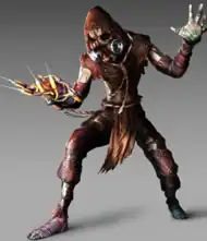 - Scarecrow returns in Batman: Arkham Knight (2015),[47][48] having aligned himself with the titular Arkham Knight, Simon Stagg, and several of Gotham City's supervillains in an attempt to kill Batman.[49] After being mauled by Killer Croc, causing him to wear a leg brace and surgically reconstruct his disfigured face to resemble his mask, Scarecrow forces the civilian evacuation of Gotham by threatening to unleash his new, more potent strain of fear toxin on Halloween, allowing the Knight's militia to occupy the city.[50] Over the course of the game, he manufactures the toxin at Ace Chemicals in an attempt to cover the Eastern Seaboard with fear gas, kidnaps Barbara Gordon, and betrays Stagg to seize control of his "Cloudburst" device to spread his toxin across Gotham, only to be thwarted by Batman while Poison Ivy sacrifices herself to reverse the toxin's effects. Following the Arkham Knight's defeat, his militia defect to Scarecrow, who tries to force Commissioner Jim Gordon to kill Batman in exchange for Barbara's life. While Batman rescues her, the militia kidnap Jim and Robin to force Batman to surrender at Arkham Asylum. Scarecrow unmasks Batman as Bruce Wayne on live television before injecting him with fear toxin,[51] but Batman overcomes his fears once more and subdues Scarecrow with his own toxin, after which he is taken into GCPD custody.[52]