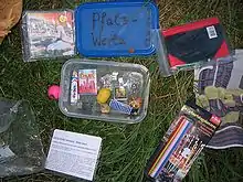 A scavenger hunt is a game in which the organizers prepare a list defining specific items, which the participants seek to gather or complete all items on the list, usually without purchasing them.[1] Usually participants work in small teams, although the rules may allow individuals to participate. The goal is to be the first to complete the list or to complete the most items on that list. In variations of the game, players take photographs of listed items or be challenged to complete the tasks on the list in the most creative manner. A treasure hunt is another name for the game, but it may involve following a series of clues to find objects or a single prize in a particular order.