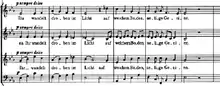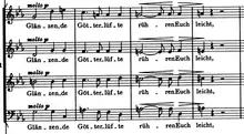 The orchestra returns to prominence at measure 52 with harplike accompaniment as the chorus presents a new melody to the line Wie die Finger der Künstlerin Heilige Saiten. At measure 64, the orchestra cadences in the dominant key (B♭ major) before repeating the first thematic melody line originally stated by the alto voices.