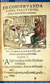 The origins of the "School" should date back to the 9th century, though the documentation for this first period is rather poor. Little is known about the nature, lay or monastic, of doctors who were part of it, and it is unclear whether the "School" already had an institutionalized organization. Antonio Mazza dates the foundation of the school in 802.[1][2][3] The Historia inventionis ac translationis et miracula Sanctae Trophimenae chronicle narrates that in the period in which Pulcari was prefect of Amalfi (867–878 c.) a young woman by the name of Theodonanda fell seriously ill. Her husband and relatives took her to Salerno to be treated by the great archiater Hyerolamus, who visits her and consults a great amount of books ("immensa volumina librorum").[4][5]