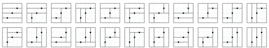 Similarly, the Schröder numbers count the number of ways to divide a rectangle into smaller rectangles using cuts through points given inside the rectangle in general position, each cut intersecting one of the points and dividing only a single rectangle in two (i.e., the number of structurally-different guillotine partitions). This is similar to the process of triangulation, in which a shape is divided into nonoverlapping triangles instead of rectangles. The following figure shows the 6 such dissections of a rectangle into 3 rectangles using two cuts: