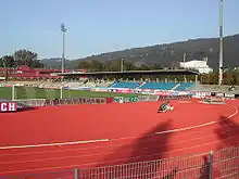 The ImmoAgentur Stadium in Bregenz, which was constructed in 1994 as the Casino Stadium to replace the demolished Bodensee Stadium, has a capacity of 12,000 spectators (of which approx. 4,000 are seated).[9] The record attendance was 10,800 for the Vorarlberg derby against SC Austria Lustenau in the Austrian Bundesliga in the autumn of 1999. Since the bankruptcy of SW Bregenz in 2005, the successor club SC Bregenz and, since the 2013–14, Schwarz-Weiß Bregenz, have played their home games there. The stadium is located close to the city centre (next to the railway station and the Festspielhaus Bregenz) and in the immediate vicinity of Lake Constance.[10]