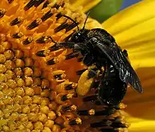 Scopa of a Melissodes (family Apidae) on a sunflower; only the hind tibia carries pollen