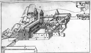 The abbey complex consisted of a number of buildings. The two most significant structures, the church and the cloister, both survive. The cloister is however significantly altered, having been destroyed by fires in 1278 and 1546, and rebuilt between 1866 and 1872.[6] The entire complex was originally surrounded by a wall, which separated a cemetery to the north of the church from the street that led westwards out of the city.[7]