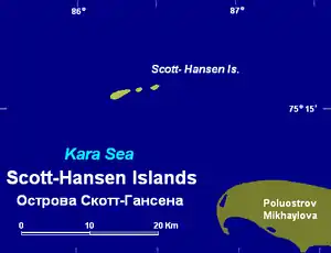 The Scott Hansen Islands (Russian: Острова Скотт-Гансена, Ostrova Skott-Gansena) is a group of three small islands covered with tundra vegetation. It is located in the Kara Sea, about 20 km from the tip of the Mikhailov Peninsula in the coast of Siberia. In many maps these islands appear with the name Scott-Gansen Islands; this version of the name is inspired by the Russian spelling.