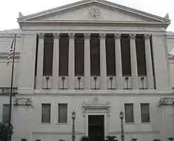 The building features notable architectural elements including: gabled front portico, Corinthian columns, a terracotta frieze, and elaborately sculpted bronze front doors featuring George Washington and Sam Houston which were created by Pompeo Coppini.[2] Coppini was a thirty-second degree member of the San Antonio Consistory. In 1936, sculptor Coppini was one of the honored guests who delivered an address at the November 15 dedication and installation of the doors.[3][4]