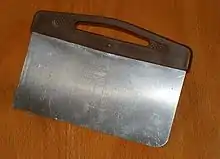 A dough scraper is a tool used by bakers to manipulate dough and to clean surfaces on which dough has been worked. It is generally a small sheet of stainless steel (approximately 8 centimetres (3.1 in) by 13 centimetres (5.1 in)) with a handle of wood, plastic, or simply a roll in the steel blade along one of the long sides.