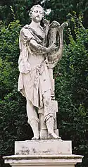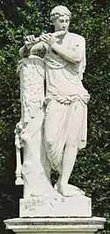 | 31 | Amphion | Joseph Baptist Hagenauer | Amphion was the son of Zeus by Antiope.[37] After she was raped by Zeus, Antiope fled to Sicyon and married King Epopeus. She was later captured by Nycteus or Lycus and taken back to Thebes. Along the way she gave birth to the twins and was forced to leave them on Mount Cithaeron. After being enslaved by Lycus and his wife Dirce, who treated her cruelly for many years, Antiope escaped and eventually found her sons, who avenged her captivity by killing Dirce—tying her to the horns of a bull.[38] Amphion and Zethus went on to conquer Thebes, where they ruled together. Amphion became a great singer and musician after Hermes taught him to play and gave him a golden lyre. He and his brother built the walls around the Cadmea, the citadel of Thebes. Amphion's musical skill was so great that when played his lyre, the stones simply moved into place.[38] | ![]() |