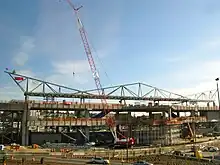 On September 22, 2006, Sound Transit and the Port of Seattle broke ground on the Airport Link extension, beginning three years of light rail and roadway construction.[48][49] The airport's return-to-terminal ramps were closed for demolition in October, clearing the site of the future station.[50] Construction of the SeaTac/Airport light rail station was bid out to Mowat Construction for $35.8 million in July 2007; the initial bid in March was set above Sound Transit's estimates at $95.3 million by Mowat, the sole bidder, and subsequently reduced the scope of the contract and removed elements of the station to bring costs down.[51][52] A second contract signed with Mowat in February 2008 brought the total cost of the station's construction to $72 million.[53] The 1.7-mile-long (2.7 km) light rail guideway approaching the station would be built by PCL Construction as $38 million addition to their contract to build the guideway in Tukwila.[54]
