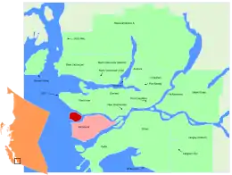 ![]() Sea Island (in red) within the rest of Richmond (pink, which occupies much of Lulu Island) and Metro Vancouver (green) | |